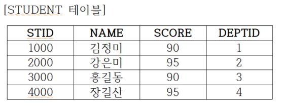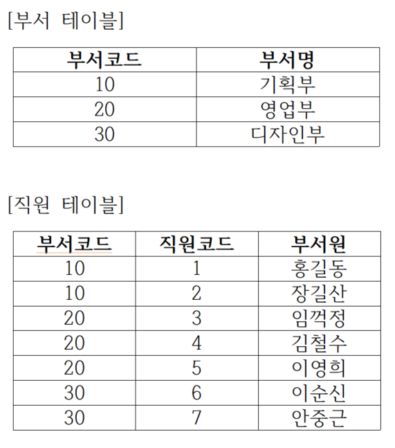 💡 [직원] 테이블과 [부서] 테이블이 다음과 같을 때 다음 쿼리를 수행한 결과를 쓰시오. [단답형] 2022년 3회