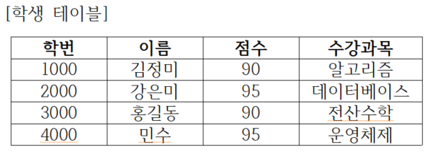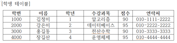 💡 학생 테이블은 학번(VARCHAR), 이름(VARCHAR), 학년(NUMBER), 수강과목(VARCHAR), 점수(NUMBER), 연락처(VARCHAR)를 속성으로 가진다. 아래 조건을 만족하는 SQL 문을 작성하시오. [단답형] 2020년 2회