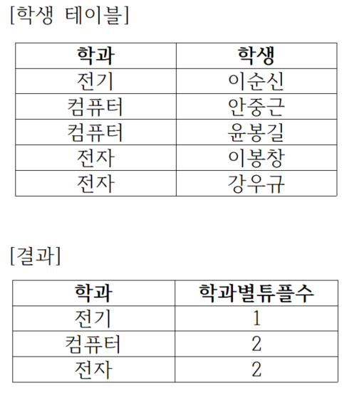 SELECT 학과, COUNT(학과) AS 학과별튜플수 -- 학과별 튜플 수를 조회하여 학과와 함께 출력하며, 열 별칭을 학과별튜플수로 지정